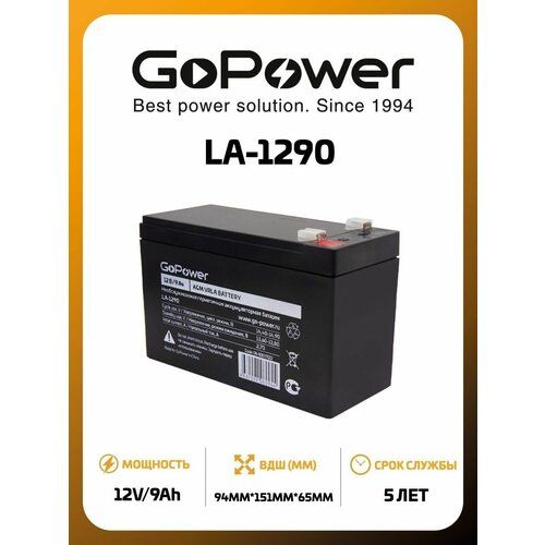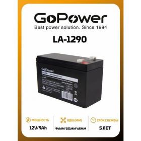 Аккумулятор свинцово-кислотный GoPower LA-1290 12V 9Ah. Свинцово-кислотные аккумуляторные батареи GoPower полностью герметизированные, необслуживаемые, с системой рекомбинации газов (VRLA). Производятся по технологии AGM -электролит абсорбирован в стекловолоконном сепараторе, что обеспечивает абсолютную защищенность от утечки электролита. Материал корпуса и крышки сделан из огнеупорного ABS пластика. Аккумуляторные батареи GoPower LA 1290 отличаются широким диапазоном рабочих температур от - 20 С до +50 С и минимальным саморазрядом не более 2,5 % в месяц при нормальных условиях. Аккумуляторы соответствуют международным стандартам безопасности и рекомендованы для применения в охранно-пожарных системах, системах контроля и управления доступом, источниках бесперебойного питания (ИБП), телекоммуникационном оборудовании, осветительном оборудовании, детских электромашинах (электромобилях) и других областях.