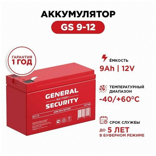 General Security 9-12 — необслуживаемый герметизированный аккумулятор с номинальной емкостью 9 Ач и напряжением 12В выполненный по технологии AGM.