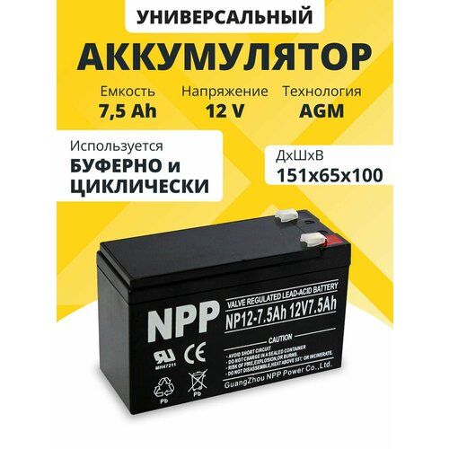 Найти - Аккумулятор для ибп 12v 7.5 Ah NPP AGM F2/T2 акб детской машинки, мотоцикла 151x65x100 мм