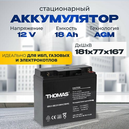 Аккумулятор для ибп THOMAS GB AGM 12v 18ah – устройство, предназначенное для обеспечения стабильного электропитания при отключении основного источника энергии. Бесперебойник для дома, компьютера играет важную роль в защите оборудования от потерь данных и повреждений, вызванных внезапными сбоями электроснабжения. Одним из лидеров на рынке стационарных аккумуляторов 12 вольт является серия Thomas, гарантирующая надежность и эффективность в работе источников бесперебойного питания. В аккумуляторе AGM 12В электролит абсорбирован в стекловолоконном сепараторе, что обеспечивает герметичность, устойчивость к вибрациям и низкое электрическое сопротивление. Они отличаются высокой стойкостью к глубокому разряду, большим количеством циклов перезаряда, прочным корпусом. Аккумуляторы для детской машины, мотоцикла, электромобиля являются безопасными для человека и окружающей среды, поскольку не выделяют вредных паров и не подвержены вытеканию электролита. Еще одно преимущество аккумуляторов для машинки на радиоуправлении – их можно монтировать в произвольном положении под наклоном, даже в перевернутом состоянии. Аккумуляторы для бесперебойника не требуют обслуживания, рекомендованы для использования как в буферном, так и циклическом режимах. Акб для источников резервного питания являются универсальными: пк, компьютеры, газовые и электро котлы отопления, аварийное освещение, системы видеонаблюдения, охранная пожарная сигнализация, извещатель, телекоммуникации, связь, промышленные установки, электропастухи, эхолоты 12v, детские машинки, скутеры, квадроциклы, электромашины, игрушки для ребенка, фонари, фонарики, весы, опрыскиватели садовые умница, осветительные и переносные приборы, солнечные панели и батареи. Регулярно проверяйте состояние и уровень заряда акб для ибп. В нашем магазине можно приобрести подходящее зарядное устройство. Перед покупкой уточните рабочие параметры ранее установленной свинцово-кислотной батареи.
