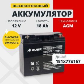 Аккумулятор для ибп ZUBR HR AGM 12v 18ah – устройство, предназначенное для обеспечения стабильного электропитания при отключении основного источника энергии. Бесперебойник для дома, компьютера играет важную роль в защите оборудования от потерь данных и повреждений, вызванных внезапными сбоями электроснабжения. Одним из лидеров на рынке стационарных аккумуляторов 12 вольт является серия ZUBR, гарантирующая надежность и эффективность в работе источников бесперебойного питания. В аккумуляторе AGM 12В электролит абсорбирован в стекловолоконном сепараторе, что обеспечивает герметичность, устойчивость к вибрациям и низкое электрическое сопротивление. Они отличаются высокой стойкостью к глубокому разряду, большим количеством циклов перезаряда, прочным корпусом. Аккумуляторы для детской машины, мотоцикла, электромобиля являются безопасными для человека и окружающей среды, поскольку не выделяют вредных паров и не подвержены вытеканию электролита. Еще одно преимущество аккумуляторов для машинки на радиоуправлении – их можно монтировать в произвольном положении под наклоном, даже в перевернутом состоянии. Аккумуляторы для бесперебойника не требуют обслуживания, рекомендованы для использования как в буферном, так и циклическом режимах. Акб для источников резервного питания являются универсальными: кассовые аппараты, кассы, медицинское, торговое оборудование, пк, компьютеры, газовые и электро котлы отопления, аварийное освещение, системы видеонаблюдения, охранная пожарная сигнализация, извещатель, телекоммуникации, связь, промышленные установки, электропастухи, эхолоты 12v, насосы, детские машинки, скутеры, квадроциклы, электромашины, игрушки для ребенка, инвалидные коляски, фонари, фонарики, весы, опрыскиватели садовые умница, осветительные и переносные приборы, солнечные панели и батареи. Регулярно проверяйте состояние и уровень заряда акб для ибп. Перед покупкой уточните рабочие параметры ранее установленной свинцово-кислотной батареи.