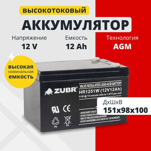 Аккумулятор для ибп ZUBR HR AGM 12v 12ah – устройство, предназначенное для обеспечения стабильного электропитания при отключении основного источника энергии. Бесперебойник для дома, компьютера играет важную роль в защите оборудования от потерь данных и повреждений, вызванных внезапными сбоями электроснабжения. Одним из лидеров на рынке стационарных аккумуляторов 12 вольт является серия ZUBR, гарантирующая надежность и эффективность в работе источников бесперебойного питания. В аккумуляторе AGM 12В электролит абсорбирован в стекловолоконном сепараторе, что обеспечивает герметичность, устойчивость к вибрациям и низкое электрическое сопротивление. Они отличаются высокой стойкостью к глубокому разряду, большим количеством циклов перезаряда, прочным корпусом. Аккумуляторы для детской машины, мотоцикла, электромобиля являются безопасными для человека и окружающей среды, поскольку не выделяют вредных паров и не подвержены вытеканию электролита. Еще одно преимущество аккумуляторов для машинки на радиоуправлении – их можно монтировать в произвольном положении под наклоном, даже в перевернутом состоянии. Аккумуляторы для бесперебойника не требуют обслуживания, рекомендованы для использования как в буферном, так и циклическом режимах. Акб для источников резервного питания являются универсальными: кассовые аппараты, кассы, медицинское, торговое оборудование, пк, компьютеры, аварийное освещение, телекоммуникации, связь, промышленные установки, электропастухи, эхолоты 12v, насосы, детские машинки, скутеры, квадроциклы, электромашины, игрушки для ребенка, инвалидные коляски, фонари, фонарики, весы, опрыскиватели садовые умница, осветительные и переносные приборы, солнечные панели и батареи. Регулярно проверяйте состояние и уровень заряда акб для ибп. В нашем магазине можно приобрести подходящее зарядное устройство. Перед покупкой уточните рабочие параметры ранее установленной свинцово-кислотной батареи.