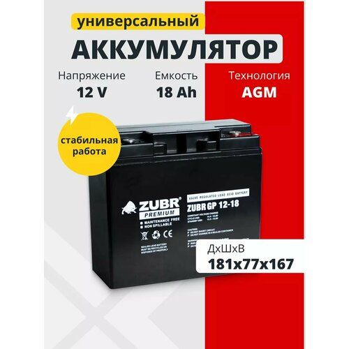 Аккумулятор для ибп ZUBR GP AGM 12v 18ah – устройство, предназначенное для обеспечения стабильного электропитания при отключении основного источника энергии. Бесперебойник для дома, компьютера играет важную роль в защите оборудования от потерь данных и повреждений, вызванных внезапными сбоями электроснабжения. Одним из лидеров на рынке стационарных аккумуляторов 12 вольт является серия ZUBR, гарантирующая надежность и эффективность в работе источников бесперебойного питания. В аккумуляторе AGM 12В электролит абсорбирован в стекловолоконном сепараторе, что обеспечивает герметичность, устойчивость к вибрациям и низкое электрическое сопротивление. Они отличаются высокой стойкостью к глубокому разряду, большим количеством циклов перезаряда, прочным корпусом. Аккумуляторы для детской машины, мотоцикла, электромобиля являются безопасными для человека и окружающей среды, поскольку не выделяют вредных паров и не подвержены вытеканию электролита. Еще одно преимущество аккумуляторов для машинки на радиоуправлении – их можно монтировать в произвольном положении под наклоном, даже в перевернутом состоянии. Аккумуляторы для бесперебойника не требуют обслуживания, рекомендованы для использования как в буферном, так и циклическом режимах. Акб для источников резервного питания являются универсальными: кассовые аппараты, кассы, медицинское, торговое оборудование, пк, компьютеры, газовые и электро котлы отопления, аварийное освещение, системы видеонаблюдения, охранная пожарная сигнализация, извещатель, телекоммуникации, связь, промышленные установки, электропастухи, эхолоты 12v, насосы, детские машинки, скутеры, квадроциклы, электромашины, игрушки для ребенка, инвалидные коляски, фонари, фонарики, весы, опрыскиватели садовые умница, осветительные и переносные приборы, солнечные панели и батареи. Регулярно проверяйте состояние и уровень заряда акб для ибп. Перед покупкой уточните рабочие параметры ранее установленной свинцово-кислотной батареи.