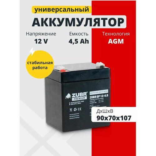 Аккумулятор для ибп ZUBR GP AGM 12v 4,5ah – устройство, предназначенное для обеспечения стабильного электропитания при отключении основного источника энергии. Бесперебойник для дома, компьютера играет важную роль в защите оборудования от потерь данных и повреждений, вызванных внезапными сбоями электроснабжения. Одним из лидеров на рынке стационарных аккумуляторов 12 вольт является серия ZUBR, гарантирующая надежность и эффективность в работе источников бесперебойного питания. В аккумуляторе AGM 12В электролит абсорбирован в стекловолоконном сепараторе, что обеспечивает герметичность, устойчивость к вибрациям и низкое электрическое сопротивление. Они отличаются высокой стойкостью к глубокому разряду, большим количеством циклов перезаряда, прочным корпусом. Аккумуляторы для детской машины, мотоцикла, электромобиля являются безопасными для человека и окружающей среды, поскольку не выделяют вредных паров и не подвержены вытеканию электролита. Еще одно преимущество аккумуляторов для машинки на радиоуправлении – их можно монтировать в произвольном положении под наклоном, даже в перевернутом состоянии. Аккумуляторы для бесперебойника не требуют обслуживания, рекомендованы для использования как в буферном, так и циклическом режимах. Акб для источников резервного питания являются универсальными: кассовые аппараты, кассы, медицинское, торговое оборудование, пк, компьютеры, телекоммуникации, связь, промышленные установки, электропастухи, эхолоты 12v, детские машинки, скутеры, квадроциклы, электромашины, игрушки для ребенка, фонари, фонарики, весы, опрыскиватели садовые умница, осветительные и переносные приборы, солнечные панели и батареи. Регулярно проверяйте состояние и уровень заряда акб для ибп. В нашем магазине можно приобрести подходящее зарядное устройство. Перед покупкой уточните рабочие параметры ранее установленной свинцово-кислотной батареи.