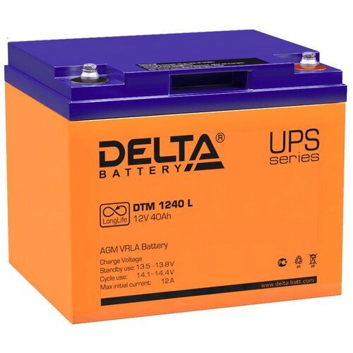 Герметизированный VRLA cвинцово-кислотный аккумулятор Delta DTM 1240 L напряжением 12В и емкостью 40Ач изготовлен по технологии AGM (с микропористым заполнителем, пропитанным электролитом). Корпус изготовлен из негорючего ABS пластика. Срок службы аккумулятора достигает 12 лет. Аккумулятор предназначен для работы в режиме постоянного подзаряда (буферный режим) или в режиме разряд-заряд (циклический режим). Обладает низким внутренним сопротивлением и саморазрядом.