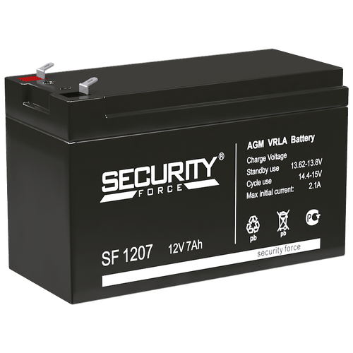 Свинцово-кислотный аккумулятор Security Force SF-1207 емкостью 7 А/ч и напряжением 12 В предназначен для обеспечения резервным питанием ИБП, устройств охранно-пожарной сигнализации и комплексов безопасности. Также аккумулятор может быть применён для питания эхолотов.