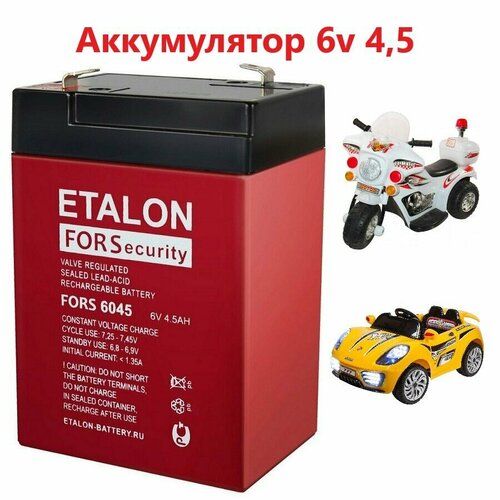Размер 70х47х101 мм. аккумулятор для мотоцикла 6v 4.5ah, свинцово-кислотные аккумуляторы Etalon Forse 6045 (6В 4.5А/ч) специально разработаны для нетребовательных систем и оптимизированы для работы в буферном режиме. Аккумуляторные батареи имеют низкое внутреннее сопротивление и высокую плотность энергии. Отвечая международным стандартам безопасности, аккумуляторы рекомендованы для применения в охранно-пожарных системах и системах контроля и управления доступом. Аккумуляторы успешно применяются для детских электромобилей и мотоциклов, электроигрушек, ИБП UPS и другое. Срок службы 3 - 5 лет. Аккумулятор для электромобиля, мотоцикла. Проверяйте размеры аккумулятора в карточке товара, чтобы аккумулятор точно подошел вам. Также проверяйте вольтаж, это важно для работы вашего прибора не требуется долив воды