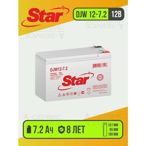DJW12-7.2 STAR — высокоэффективная перезаряжаемая батарея, которая соответствует всем необходимым требованиям для бесперебойного питания электрооборудования. Это герметизированная аккумуляторная батарея, которая не требует дополнительного обслуживания и имеет срок службы — 8 лет.
