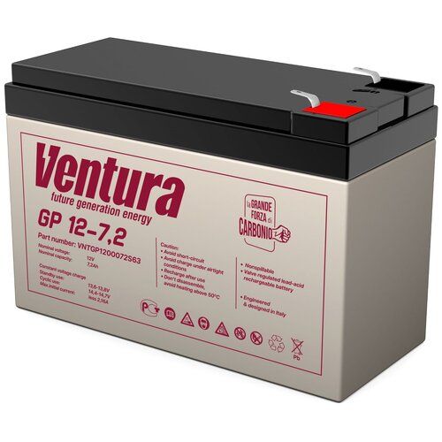 Аккумулятор обладает низким внутренним сопротивлением, он может использоваться в буферном и циклическом режимах. Благодаря своим характеристикам (7.2 Ач, 12 В) и продолжительному сроку службы (6 лет) он применяется в ИБП, нефтегазовой отрасли, охранно-охранных системах и телекоммуникациях. Корпус представляет из себя герметичный моноблок, выполненный из ABS-пластика, на крышке которого располагается односторонний клапан избыточного давления, это позволяет использовать Ventura GP 12-7.2 в горизонтальном и вертикальном положении (установка на крышку не допускается). Сепараторы из стекловолокна (AGM) удерживают жидкий электролит неподвижно.