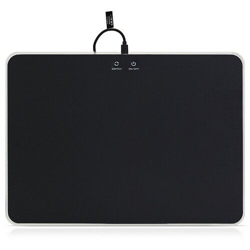 Твёрдый коврик для компьютерной мышки с подсветкой. Прочная нейлоновая плёнка обеспечивает лёгкое скольжение мышки по поверхности. Пластиковая основа позволяет разместить коврик даже на неровной поверхности. Вспененная резиновая подложка препятствует смещению самого коврика. Переключаемая RGB подсветка имеет несколько профилей, сменяемых нажатием кнопки SWITCH: красный, жёлтый, зелёный, голубой, синий, фиолетовый, белый, переливающийся (изменение яркости - нажатие On|Off, отключение подсветки - удержание On|Off).