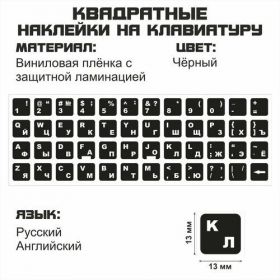 Набор виниловых наклеек с английскими и русскими символами. Фон чёрный, буквы белые. Размер наклейки на одну клавишу 13x13 мм. Виниловые наклейки на клавиатуру для комфортной работы за компьютером. Наклейки изготовлены в России из высококачественной плёнки и имеют защитную ламинацию. Ламинация защищает наклейки от стирания, что гарантирует долгую службу.