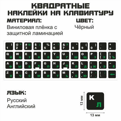 Набор виниловых наклеек с английскими и русскими символами. Фон чёрный, буквы зелёные. Размер наклейки на одну клавишу 13x13 мм. Виниловые наклейки на клавиатуру для комфортной работы за компьютером. Наклейки изготовлены в России из высококачественной плёнки и имеют защитную ламинацию. Ламинация защищает наклейки от стирания, что гарантирует долгую службу.