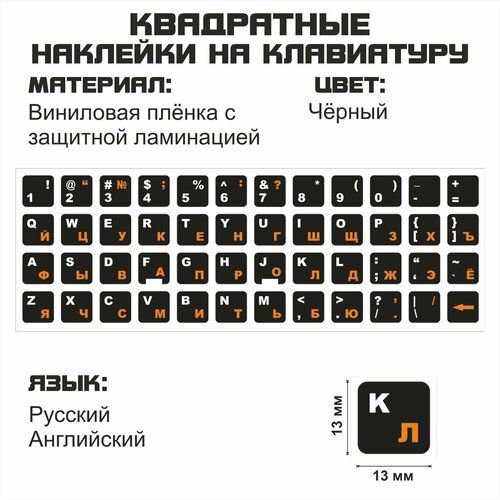 Набор виниловых наклеек с английскими и русскими символами. Фон чёрный, буквы оранжевые. Размер наклейки на одну клавишу 13x13 мм. Виниловые наклейки на клавиатуру для комфортной работы за компьютером. Наклейки изготовлены в России из высококачественной плёнки и имеют защитную ламинацию. Ламинация защищает наклейки от стирания, что гарантирует долгую службу.