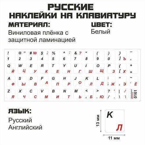 Набор виниловых наклеек с английскими и русскими символами. Фон белый, буквы красные. Размер наклейки на одну клавишу 11x13 мм. Виниловые наклейки на клавиатуру для комфортной работы за компьютером. Наклейки изготовлены в России из высококачественной плёнки и имеют защитную ламинацию. Ламинация защищает наклейки от стирания, что гарантирует долгую службу.