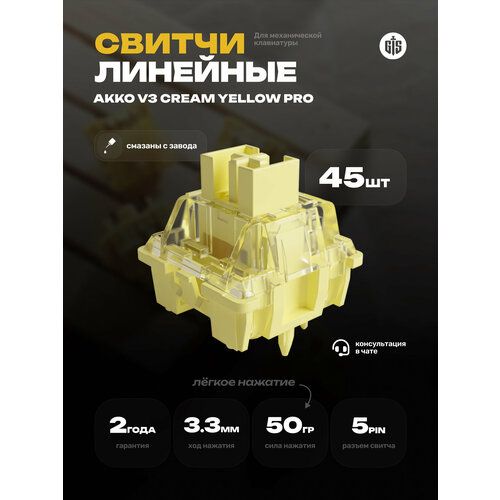 НАЙТИ ВЫГОДНЕЕ - Механические переключатели (свитчи) Akko V3 Cream Yellow PRO (Линейные) 45 штук, линейные, смазаны, 5-pin, 50 грамм