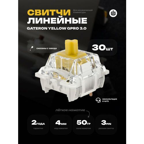 Найти - Линейные механические переключатели (свитчи) Gateron Yellow GPro 3.0 (30 штук), 3-pin, смазаны, 50g