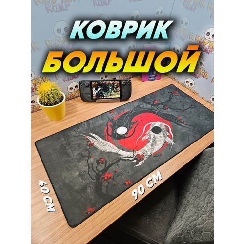 Большой игровой коврик для мышки, выполненный в традиционной японской тематике, является воплощением утонченной эстетики и символизма. На поверхности коврика изображены два карпа кои, один серого, а другой черного цвета. Эти карпы плавно движутся по кругу друг за другом, создавая ощущение непрерывного потока и гармонии.