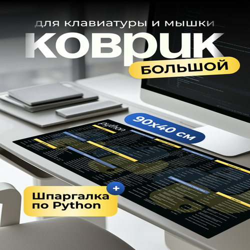 Большой коврик для мыши с функциями Python — это не просто аксессуар, а полноценная шпаргалка для начинающих программистов, студентов, школьников и всех, кто изучает язык программирования. Идеален как для обучения, так и для повседневной работы за компьютером. На коврике собраны более 100 самых нужных команд, разделённых по темам: строки, списки, словари, кортежи, множества, случайные числа, работа с файлами и ОС, математические функции, преобразование типов, статистика, работа со временем и датой. Каждый блок выделен цветом и содержит краткие пояснения к командам. Структура идеально подходит для быстрого поиска нужной функции и визуального запоминания синтаксиса. Дизайн в стиле профессиональной IDE: тёмный фон, читаемый шрифт, логичная компоновка. Не отвлекает, не утомляет глаза и гармонирует с любым рабочим пространством. Размер: 900×400 мм — увеличенный формат. На коврик помещается не только мышь, но и клавиатура или ноутбук. Материал: нескользящая резиновая основа и износостойкая тканевая поверхность с чёткой печатью. Коврик помогает быстрее освоить язык программирования. Благодаря увеличенному размеру и гладкой тканевой поверхности коврик идеально подходит для геймеров. Он обеспечивает плавное и точное скольжение мыши, что особенно важно в шутерах, стратегиях и ММО. Нескользящая основа надёжно фиксирует коврик даже при резких движениях, а прочный материал выдерживает активные игровые сессии. Совместим с любой мышью. Отличный подарок для программиста, студента или преподавателя. Один коврик — и учеба, и работа, и гейминг становятся удобнее.