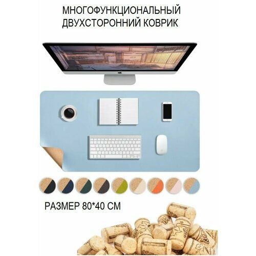 Большой коврик для мыши из экокожи и пробки, 80 х 40 см, голубой.