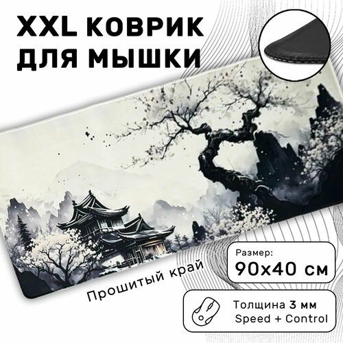 Найти - Большой игровой коврик в японском стиле для мышки и клавиатуры 90х40 см, горный пейзаж и сакура