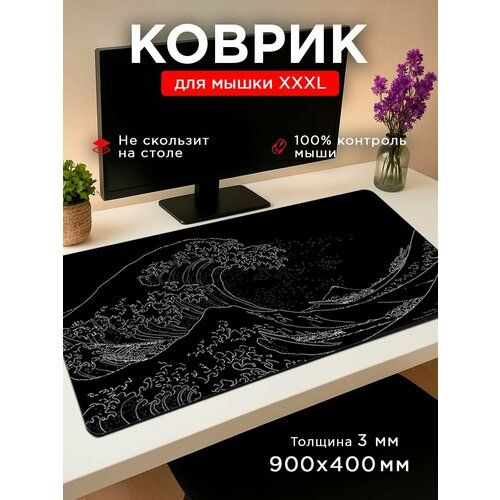 Найти - Коврик для мышки большой, игровой коврик в японском стиле для мышки и клавиатуры 90х40 см, Большая волна у Канагавы Хокусаем