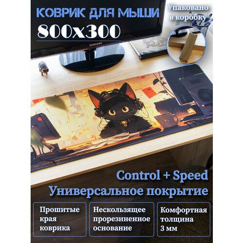 Найти - Коврик для мыши Котик работает за компьютером, игровой и для работы, прошитые края, 800x300x3 мм, нескользящий.