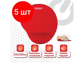 Комплект 5 шт, Коврик для мыши с подушкой под запястье SONNEN, полиуретан + лайкра, 250х220х20 мм, красный, 513301 101917248974