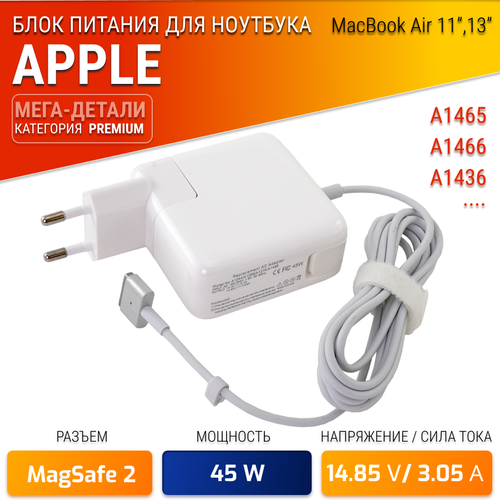 Высококачественный аналог оригинальной зарядки для ноутбука Apple MacBook Air A1465. A1466, A1436. Напряжение 14.85V, сила тока 3.05А, мощность 45W, разъем питания MagSafe 2 (T-образный штекер).