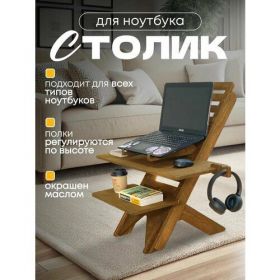 Подставка для ноутбука на стол деревянная, имеет гладкую поверхность без зацепок и неровностей, покрыта мебельным маслом. Столик очень устойчивый и может выдержать вес до 20 кг.
