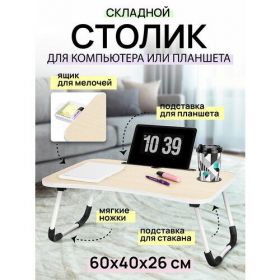 Складной столик для компьютера от ELCASA предназначен для комфортной работы с ноутбуком или другой портативной цифровой техникой. Общий размер изделия – 60х40х26 см. Лаконичный белый цвет и минималистичный дизайн органично впишут его в интерьер любой комнаты. Столешница выполнена из МДФ и оснащена пластиковыми вставками, её размер – 60х40х1,4 см. Максимальная нагрузка – 10 кг. В её поверхность встроены подставка для стакана, подставка для планшета и выдвижной ящик. Он подходит для хранения канцелярских принадлежностей и разнообразных мелочей. В большой подставке имеются два отверстия для проводов и зарядных устройств. Металлические ножки оборудованы мягкими противоскользящими накладками, которые обеспечивают устойчивость изделия на любой поверхности. Расстояние между ножками в разложенном виде – 64 см. Используйте столик на кровати, диване или в кресле – он подойдёт для любого пространства. Поставьте на него угощения, чтобы провести приятный вечер за просмотром любимого фильма или красиво сервировать завтрак в постель. Послужит в качестве письменной, книжной или журнальной поверхности. Его устойчивость сделает процесс письма удобным. Складная конструкция обеспечит компактное хранение изделия. Поставляется в дизайнерской картонной коробке – благодаря ей вам не понадобится дополнительная подарочная упаковка. Складной столик от бренда элькаса станет незаменимым аксессуаром, который добавит комфорта как рабочему процессу, так и отдыху