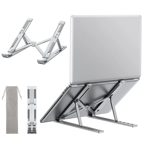 Алюминиевая подставка для ноутбуков складная, регулируемая, серебристого цвета, обеспечивает комфорт и функциональность для пользователей ноутбуков и других устройств