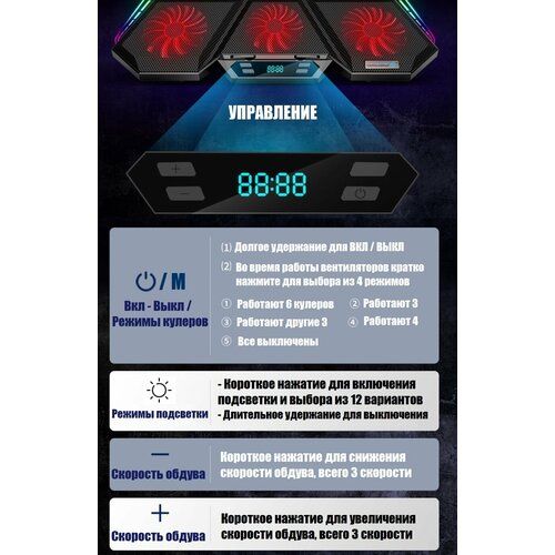 Охлаждающая подставка имеет 6 бесшумных вентиляторов, которые не только красивы, но и эффективно создают поток воздуха для ноутбука с диагональю до 17". Вентилятора имеют 4 схемы работы. Можно использовать все 6, только 3 в разных комбинациях или только 4, а также полностью выключить. Эффект быстрого охлаждения предотвращает перегрев вашего ноутбука, либо игровой консоли PS/4, 5, XBOX.