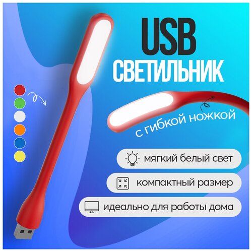Гибкий USB Led-светильник подключается в USB-порт ноутбука, компьютера, внешний аккумулятор. Светильник имеет белый рассеиватель для обеспечения равномерного света, также, с обратной стороны установлена алюминиевая пластина, которая рассеивает тепло. Выполнен из приятного на ощупь силикона Soft-Touch, а его материал позволяет сгибать его в нужном направлении, при этом сохранит свое положение. Подключается к любому устройству с USB портом. Удобный, компактный светодиодный светильник не занимает много места и легок в использовании. Миниатюрная лампочка питается от разъёма USB, этого достаточно, чтобы осветить клавиатуру, когда вы работаете, или читаете книги. Отлично подойдет для путешествий, читайте свои любимые книги в палатке, светодиодный светильник очень экономично потребляет энергию. Гибкий и упругий материал, из которого сделан корпус подсветки, обеспечивает долгий срок службы без заломов и трещин. • Преимущество: Низкое энергопотребление