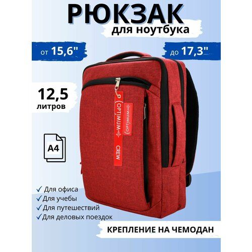 Рюкзак Optimum 17.3 RL, красный - это яркий стильный рюкзак - сумка для ноутбука, нетбука, компьютера, планшета. Рюкзак для ноутбука универсальный – его можно использовать как рюкзак для ноутбука 15.6 дюймов, так и рюкзак для ноутбука 17.3 дюйма. Совместим со всеми марками ноутбуков DELL HP Samsung Apple MacBook Acer Asus Lenovo Honor Xiaomi Msi Irbis Digma с размерами экрана 15 15.6 16 17 17.3 дюйма. Подходит для макбука, ультрабука. Есть специальный карман для документов формата A4 и аксессуаров. Компактный (объемом 12.5 литров), облегченный, надежный, эргономичной формы рюкзак для офиса, работы, учебы, путешествий и деловых поездок. Optimum 17.3 RL - это рюкзак унисекс - рюкзак для ноутбука женский, так и рюкзак для ноутбука мужской. На задней стенке ремень - крепление на ручку чемодану. Две широкие мягкие регулируемые лямки обеспечат комфорт в дороге. Лямки можно отстегнуть и спрятать в карман, а 2 удобные мягкие ручки сверху и сбоку позволят использовать изделие как деловую бизнес сумку. Рюкзак выполнен из качественной, износостойкой, высокопрочной ткани с водоотталкивающей пропиткой. Специальное отделение - отсек для ноутбука с подкладкой из неопрена, надежно защитит гаджет от ударов. 3 наружных кармана для аксессуаров, powerbank, ключей, очков. Рюкзак женский для ноутбука - стильный, яркий, модный. Рюкзак мужской для ноутбука – деловой рюкзак для города и командировок. Рюкзак для ноутбука 16 можно использовать для небольших путешествий, перелетов и прогулок по городу, для удобного и безопасного перемещения ноутбука. Рюкзак пригодится для работы фрилансеров, для учебы студентам, подросткам, мальчикам, девочкам. Отличный подарок на день рождения другу, подруге, коллеге.