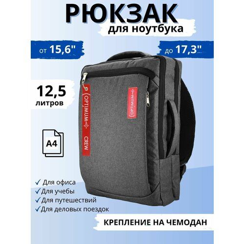 Рюкзак Optimum 17.3 RL, темно-серый - это яркий стильный рюкзак - сумка для ноутбука, нетбука, компьютера, планшета. Рюкзак для ноутбука универсальный – его можно использовать как рюкзак для ноутбука 15.6 дюймов, так и рюкзак для ноутбука 17.3 дюйма. Совместим со всеми марками ноутбуков DELL HP Samsung Apple MacBook Acer Asus Lenovo Honor Xiaomi Msi Irbis Digma с размерами экрана 15 15.6 16 17 17.3 дюйма. Подходит для макбука, ультрабука. Есть специальный карман для документов формата A4 и аксессуаров. Компактный (объемом 12.5 литров), облегченный, надежный, эргономичной формы рюкзак для офиса, работы, учебы, путешествий и деловых поездок. Optimum 17.3 RL - это рюкзак унисекс - рюкзак для ноутбука женский, так и рюкзак для ноутбука мужской. На задней стенке ремень - крепление на ручку чемодану. Две широкие мягкие регулируемые лямки обеспечат комфорт в дороге. Лямки можно отстегнуть и спрятать в карман, а 2 удобные мягкие ручки сверху и сбоку позволят использовать изделие как деловую бизнес сумку. Рюкзак выполнен из качественной, износостойкой, высокопрочной ткани с водоотталкивающей пропиткой. Специальное отделение - отсек для ноутбука с подкладкой из неопрена, надежно защитит гаджет от ударов. 3 наружных кармана для аксессуаров, powerbank, ключей, очков. Рюкзак женский для ноутбука - стильный, яркий, модный. Рюкзак мужской для ноутбука – деловой рюкзак для города и командировок. Рюкзак для ноутбука 16 можно использовать для небольших путешествий, перелетов и прогулок по городу, для удобного и безопасного перемещения ноутбука. Рюкзак пригодится для работы фрилансеров, для учебы студентам, подросткам, мальчикам, девочкам. Отличный подарок на день рождения другу, подруге, коллеге.