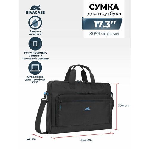 Сумка для ноутбука 17.3" и документов RIVACASE black Laptop bag 8059 подойдет для работы и учебы. Изготовлена из полиэстера, отличается износоустойчивостью и долговечностью. Для лучшей защиты ноутбука имеет толстые стенки. Для удобного использования предусмотрен регулируемый ремень и ручка. Карман для ноутбука 440x310x45 мм.