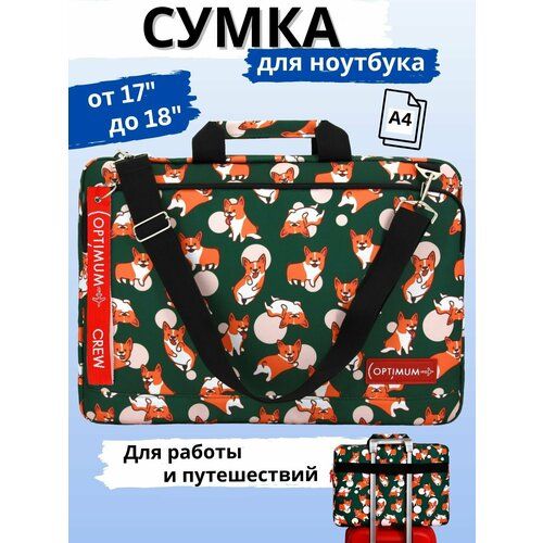 Сумка для ноутбука 17.3 17 18 дюймов от Optimum, корги - яркая стильная сумка для ноутбука с оригинальными принтами. Сумка Optimum 17.3 RL - подойдет для повседневной жизни, работы и деловых поездок. Стильная и легкая папка с ручками а4 на молнии с привлекательным дизайном не только облегчит транспортировку устройства, но и убережет его от неловких движений, ударов и непогоды. Также изделие может использоваться как органайзер или папка для документов а4, как чехол для ноутбука. Мягкая подкладка защитит ноутбук от ударов. Водоотталкивающая пропитка убережет ваше устройство от намокания. Внутри основного отделения есть резинки для фиксации ноутбука. Отстегивающийся регулируемый удобный плечевой ремень, приходящий на замену ручкам. Надежная двойная застежка-молния предотвращает случайное выпадение и обеспечивает быстрый доступ к устройству. Ремень для возможности крепления на выдвижную ручку чемодана. Внешнее отделение для аксессуаров - зарядного устройства, компьютерной мыши, HDD-накопителя, powerbank и т. д. Отличный подарок на день рождения мужчине, женщине, ребенку.