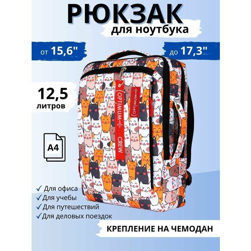 Рюкзак Optimum 17.3 RL, котики - это яркий стильный рюкзак - сумка для ноутбука, нетбука, компьютера, планшета. Рюкзак для ноутбука универсальный – его можно использовать как рюкзак для ноутбука 15.6 дюймов, так и рюкзак для ноутбука 17.3 дюйма. Совместим со всеми марками ноутбуков DELL HP Samsung Apple MacBook Acer Asus Lenovo Honor Xiaomi Msi Irbis Digma с размерами экрана 15 15.6 16 17 17.3 дюйма. Подходит для макбука, ультрабука. Есть специальный карман для документов формата A4 и аксессуаров. Компактный (объемом 12.5 литров), облегченный, надежный, эргономичной формы рюкзак для офиса, работы, учебы, путешествий и деловых поездок. Optimum 17.3 RL - это рюкзак унисекс - рюкзак для ноутбука женский, так и рюкзак для ноутбука мужской. На задней стенке ремень - крепление на ручку чемодану. Две широкие мягкие регулируемые лямки обеспечат комфорт в дороге. Лямки можно отстегнуть и спрятать в карман, а 2 удобные мягкие ручки сверху и сбоку позволят использовать изделие как деловую бизнес сумку. Рюкзак выполнен из качественной, износостойкой, высокопрочной ткани с водоотталкивающей пропиткой. Специальное отделение - отсек для ноутбука с подкладкой из неопрена, надежно защитит гаджет от ударов. 3 наружных кармана для аксессуаров, powerbank, ключей, очков. Рюкзак женский для ноутбука - стильный, яркий, модный. Рюкзак мужской для ноутбука – деловой рюкзак для города и командировок. Рюкзак для ноутбука 16 можно использовать для небольших путешествий, перелетов и прогулок по городу, для удобного и безопасного перемещения ноутбука. Рюкзак пригодится для работы фрилансеров, для учебы студентам, подросткам, мальчикам, девочкам. Отличный подарок на день рождения другу, подруге, коллеге.