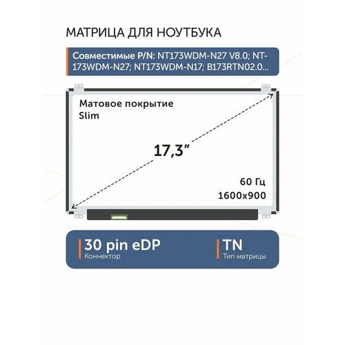 Матрица для ноутбука NT173WDM-N27 V8.0 /30 Pin eDP/1600x900/TN/матовое/уши верх-низ