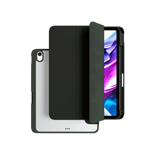 Верхняя крышка с лицевой стороны выполнена из эко-кожи с Soft Touch напылением, а ее внутренняя часть, которая соприкасается с экраном, покрыта микрофиброй. Задняя крышка изготовлена из прозрачного акрила - материала, легкого, прочного и кристально прозрачного. Справа находится специальное отделение для Apple Pencil, который обеспечивает удобное хранение и зарядку. Боковые грани выполнены из термопластичного полиуретана в цвет верхней крышки - плотно прилегают и подчеркивает геометрию устройства. Верхняя крышка крепится к задней с помощью мощных магнитов, что позволяет использовать части чехла по отдельности. Чехол имеет два режима - режим книжки и режим подставки. Поддерживает функцию автопробуждения.
