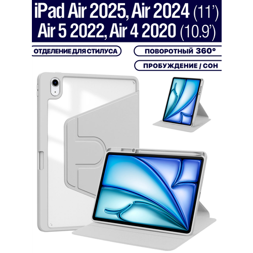 Найти - Чехол на Apple iPad Air 11 2025 (M3), Air 11 2024 (M2), Air 5 2022, Air 4 2020, микрофибра, держатель для стилуса, поворотный 360 градусов (серый)