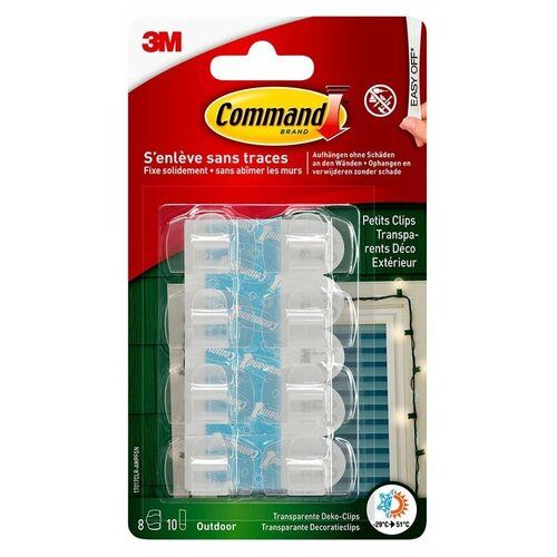 Прозрачные клипсы для улицы Command - это инновационное решение для удобной организации проводов и крепления гирлянд не только в доме, но и снаружи. Клипсы надежно держат и легко снимаются благодаря технологии 3M Stretch-Release. Зажигайте огни на веранде и в беседке, украшайте гирляндами дом снаружи, организуйте провода в гараже помощью клипс для проводов Command для улицы. Клипсы могут использоваться повторно со сменными полосками Command; в каждой упаковке есть запасные. Возможные варианты применения: Идеально подходит для проводов диаметром до 5 мм. Подходит для использования на улице или в холодных помещениях. Command не повреждает поверхности, надежно держит и удаляется без следа. Легко крепить, не нужно сверлить стены и использовать механический крепеж. Полоска легко растягивается и удаляется, не оставляя отверстий, повреждений и следов клея. Свойства сохраняются даже при воздействии влаги и прямых солнечных лучах. Подходит для гладких поверхностей, включая окрашенные стены, плитку, металл, обработанное дерево, пластик, стекло. Идеально подойдет для проводов, гирлянд. Упаковка содержит: 8 клипс и 10 полосок, размер малый. Соблюдайте инструкцию по применению: наносить на поверхность при температуре от -29 °C до 51 °C. После нанесения на стену подождите 1 час, прежде чем вешать что-либо на клипсы. Идеально подходят для твердых, ровных поверхностей и окрашенных стен. Не подходят для неокрашенных бумажных или виниловых обоев, шероховатых поверхностей.