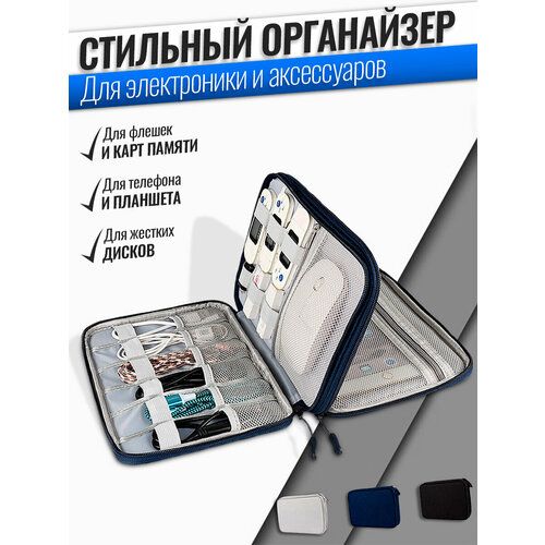 Органайзер для хранения проводов, кабелей, флешек, наушников и других гаджетов и аксессуаров незаменим дома, на работе и в путешествиях 2 внешних отделения на молнии и 16 внутренних отделений: 6 держателей с кармашком-сеткой и резинкой, 6 отделений с резинкой-держателем, 1 средний карман с сеткой на молнии, 1 большой карман с сеткой на молнии, 2 кармана с сеткой без молнии.