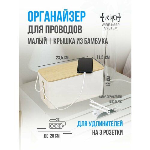 Найти - Коробка органайзер для проводов малый (23,5х11,5х12) белый бамбуковая крышка, короб для маскировки сетевых кабелей и шнуров для зарядки