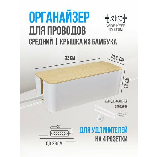 Найти - Коробка, органайзер для проводов, средний (32х13,5х13) белый бамбуковая крышка, короб для маскировки сетевых кабелей, шнуров и зарядки