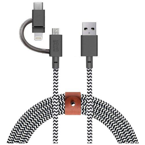 Native Union Belt Universal BELT-KV-ULC-ZEB-V2 2m представляет собой кабель-переходник с коннекторами USB и microUSB, а также встроенным адаптером на Lightning и USB-C. Он позволяет синхронизировать устройства с совместимыми интерфейсами и заряжать различные мобильные гаджеты от СЗУ, АЗУ или любого другого источника энергии. Кабель имеет сертификацию MFI и позволяет передавать данные на высокой скорости между iOS- и другими совместимыми устройствами.
