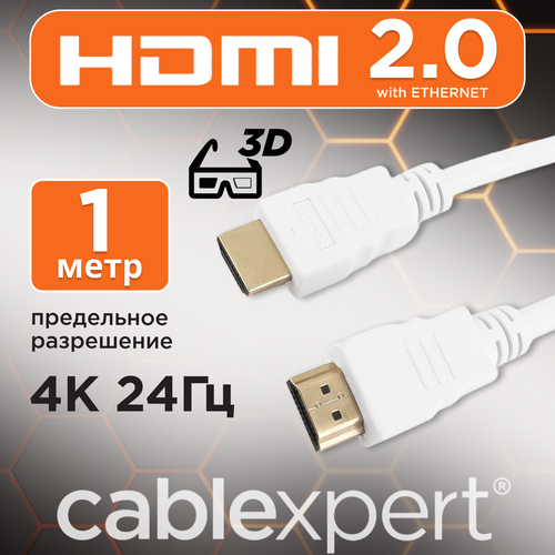 Кабель HDMI Cablexpert CC-HDMI4-W-1M, 1м, v2.0, 19M/19M, белый, позол. разъемы, экран, пакетКабель HDMI Cablexpert версии 2.0 с разъемами HDMI Male (19M) to HDMI Male (19M) и позолоченными разъемами обычно подходит для широкого спектра современных устройств, которые используют стандарт HDMI для передачи аудио и видеосигнала высокого разрешения.