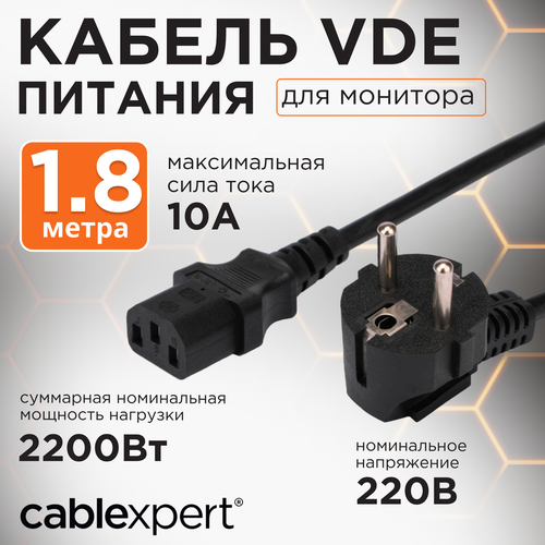 Кабель питания Cablexpert черный Schuko-C13 10A VDE с заземлением длина 1.8м PC-186-VDE - это надежный и качественный аксессуар для подключения различных устройств к электросети.