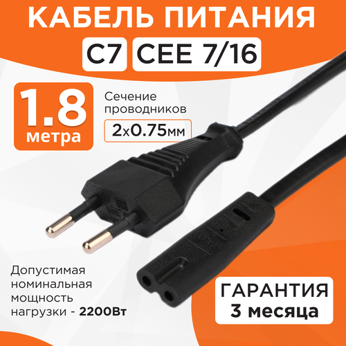 Кабель имеет длину 1.8 метра, что позволяет удобно подключать устройства на расстоянии. Все разъемы кабеля - CEE 7/16 и IEC C7, что обеспечивает совместимость с различными устройствами.
