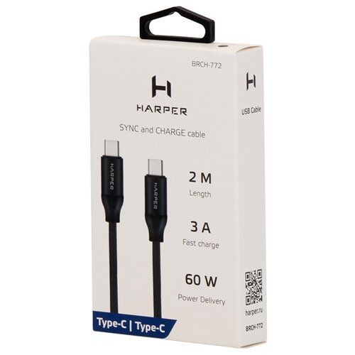 Кабели HARPER BRCH-772 выполнены в нейлоновой оплетке кабеля, которая обеспечивает повышенную износостойкость, а также оснащены металлическим коннектором. Поддерживают быструю зарядку с силой тока до 3 ампер и мощностью до 60 ватт (Power Delivery). Тип кабеля: Type-C кабель; Форма кабеля: Круглый; Разъем 1: Type-C / Разъем 2: Type-C; Корпус разъемов: Металл; Максимальный ток: 3 А; Максимальное напряжение: 5 В; Мощность: 60 Вт; Поддержка технологий: Быстрая зарядка, Power Delivery 60W; Длина кабеля: 2 метра; Версия USB: 2.0; Материал оплетки: Нейлон; Проводник: Медь.